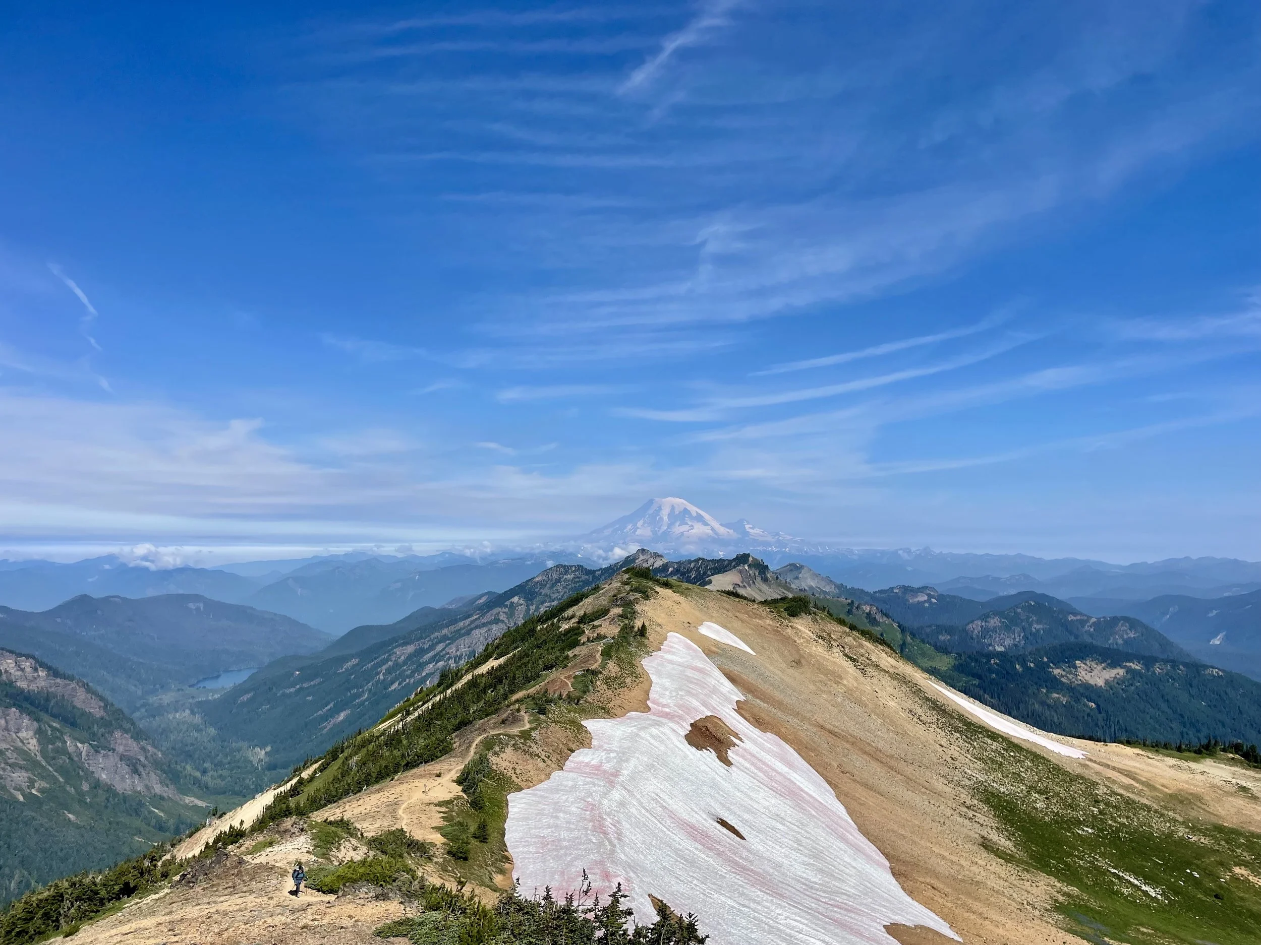 A narrow, wind-whipped ridge with thousand-foot drops on both sides, the world stretching wide in every direction. Mount Adams (Pahato) loomed behind us. Mount Rainier (Tahoma) rose ahead– two massive volcanic peaks, commanding all attention.