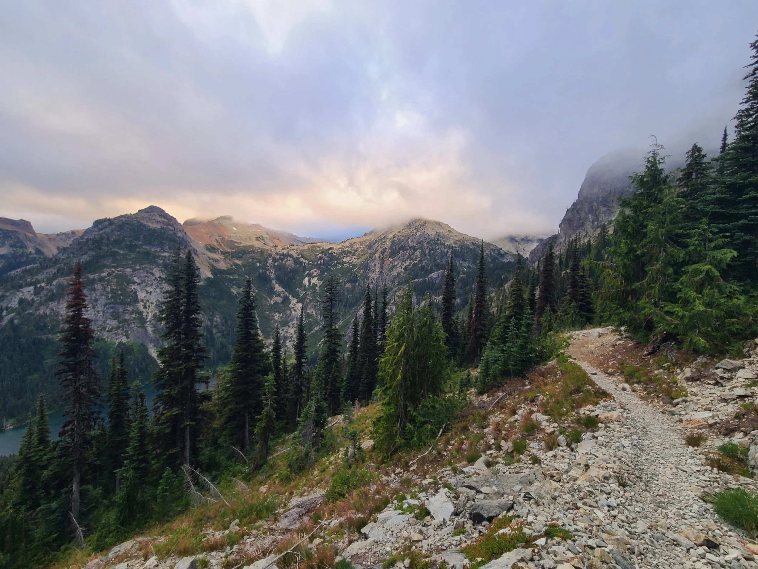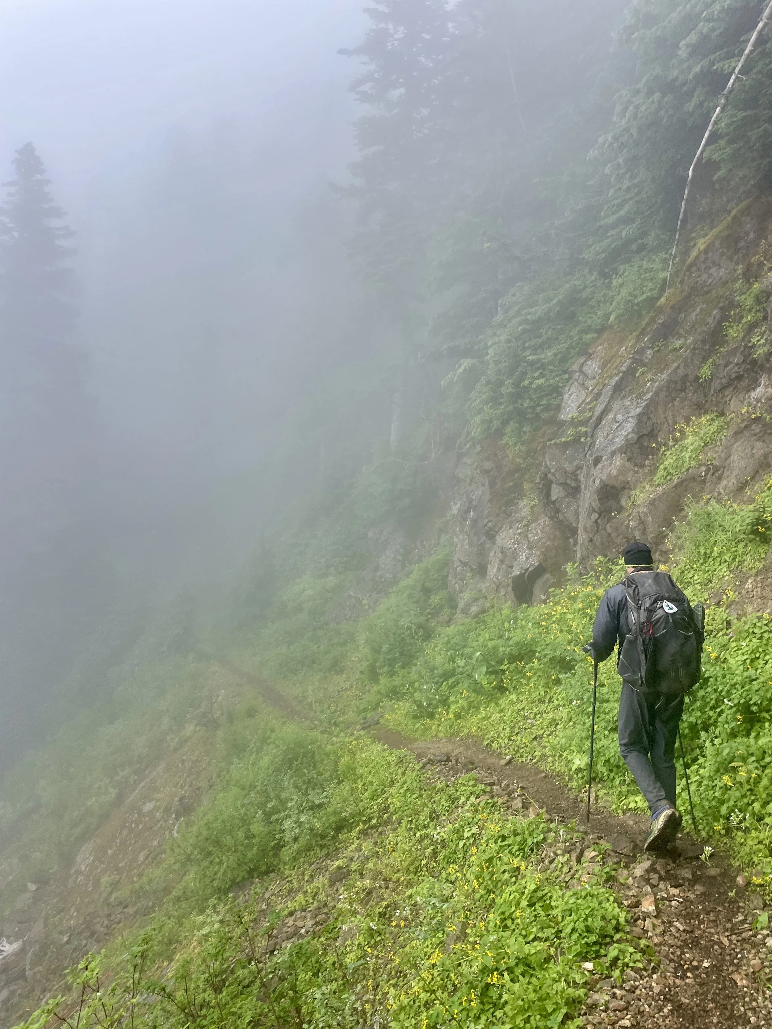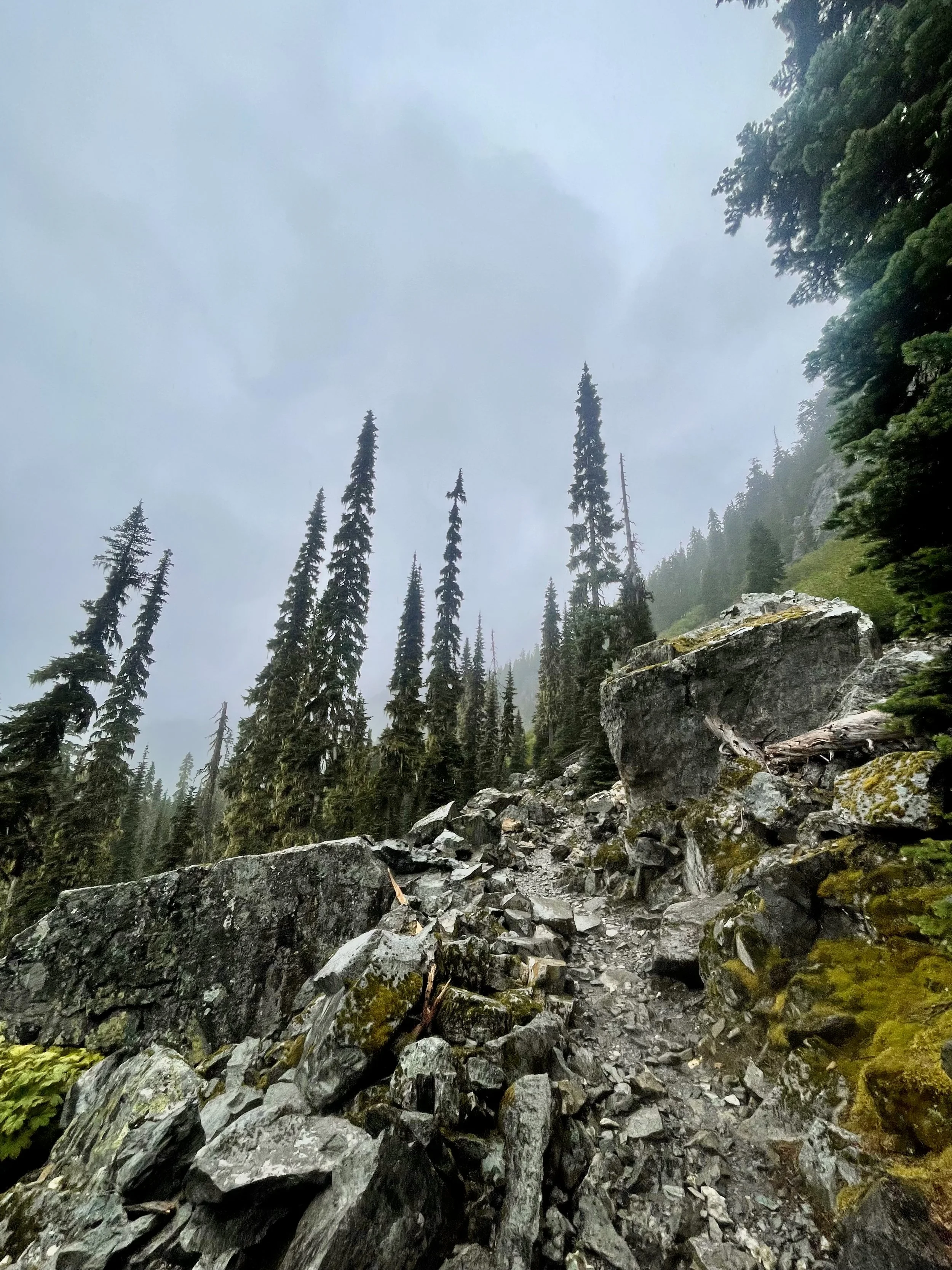 The climb out was steep enough to keep us warm, so we ditched our raincoats. That worked… until it didn’t. The rain turned icy, temperatures dropped, and my hands went numb. I swapped my wet shirt for a fleece, topped it with a raincoat, and kept moving, but our ultralight rain gear met its match in a true PNW storm—proof that ‘waterproof’ is just optimistic marketing. The trail had a way of stripping away illusion—gear, comfort, control—all of it.