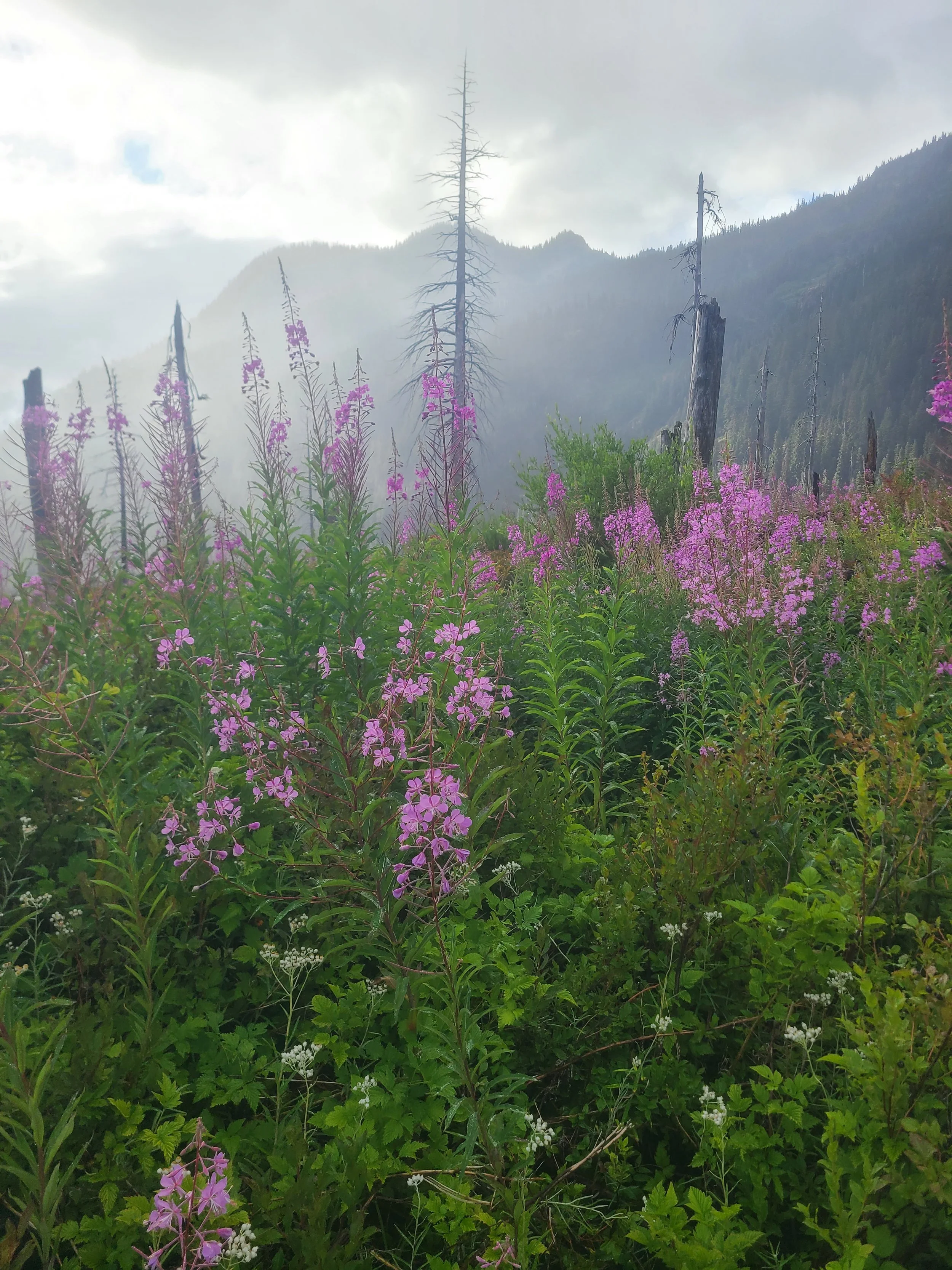 From Trout Lake, the trail climbed steadily through rainforest to subalpine meadows, and then—finally—to true alpine. Wildflowers burst across the slopes. Cold creeks tumbled from unseen glaciers. Every bend in the trail revealed a new wonder.