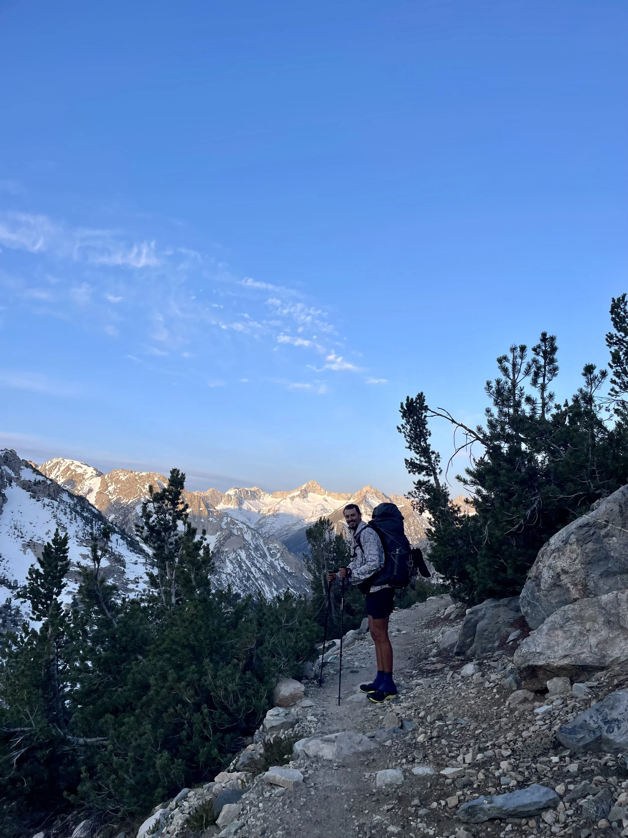 Another 3 AM alarm, cold toes, and sleepy footsteps crunching beneath the stars. Pinchot Pass was a long grind— a steep climb that had us working for every step. The views at the top made it all worth it, though: pink light spilling across the snowy peaks, the whole Sierra waking up with us.