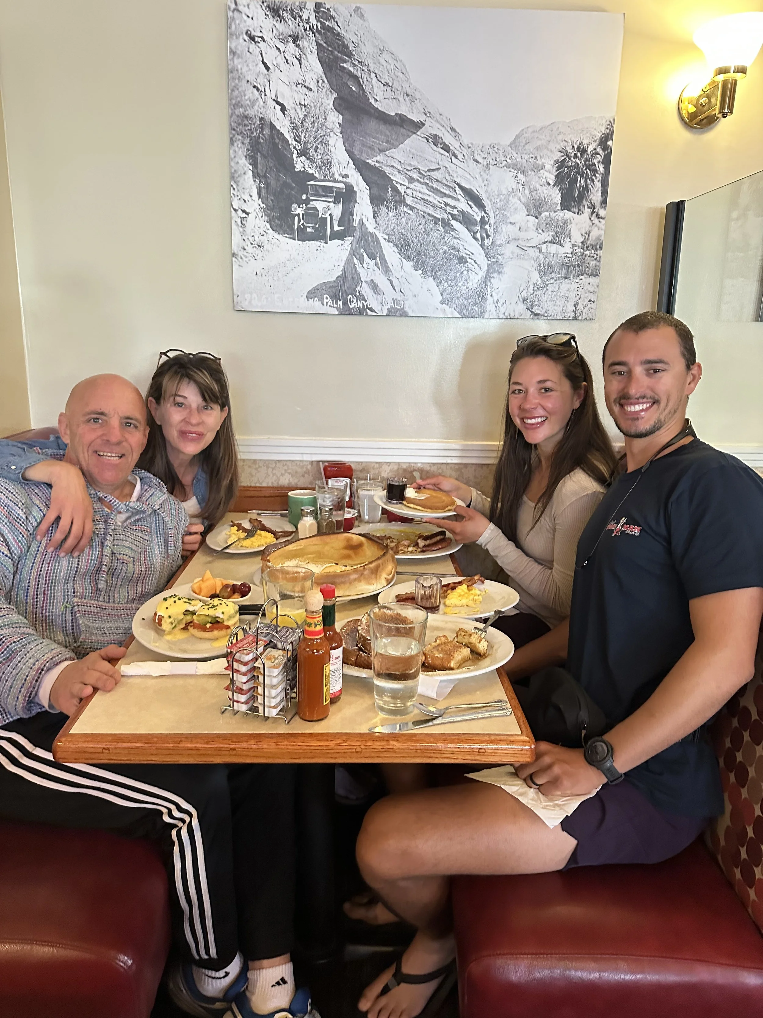 She whisked us away for a “zero” day (no miles forward) in Palm Springs, where we traded trail shoes for sandals and savored family time, good food, and deep rest. Sharing this little slice of our niche world with her was a delight—especially during our resupply. She picked up on the strategy quickly: lightweight, calorie-dense, shelf-stable. If it’s less than 100 calories per ounce, back on the shelf it goes. Trail math.