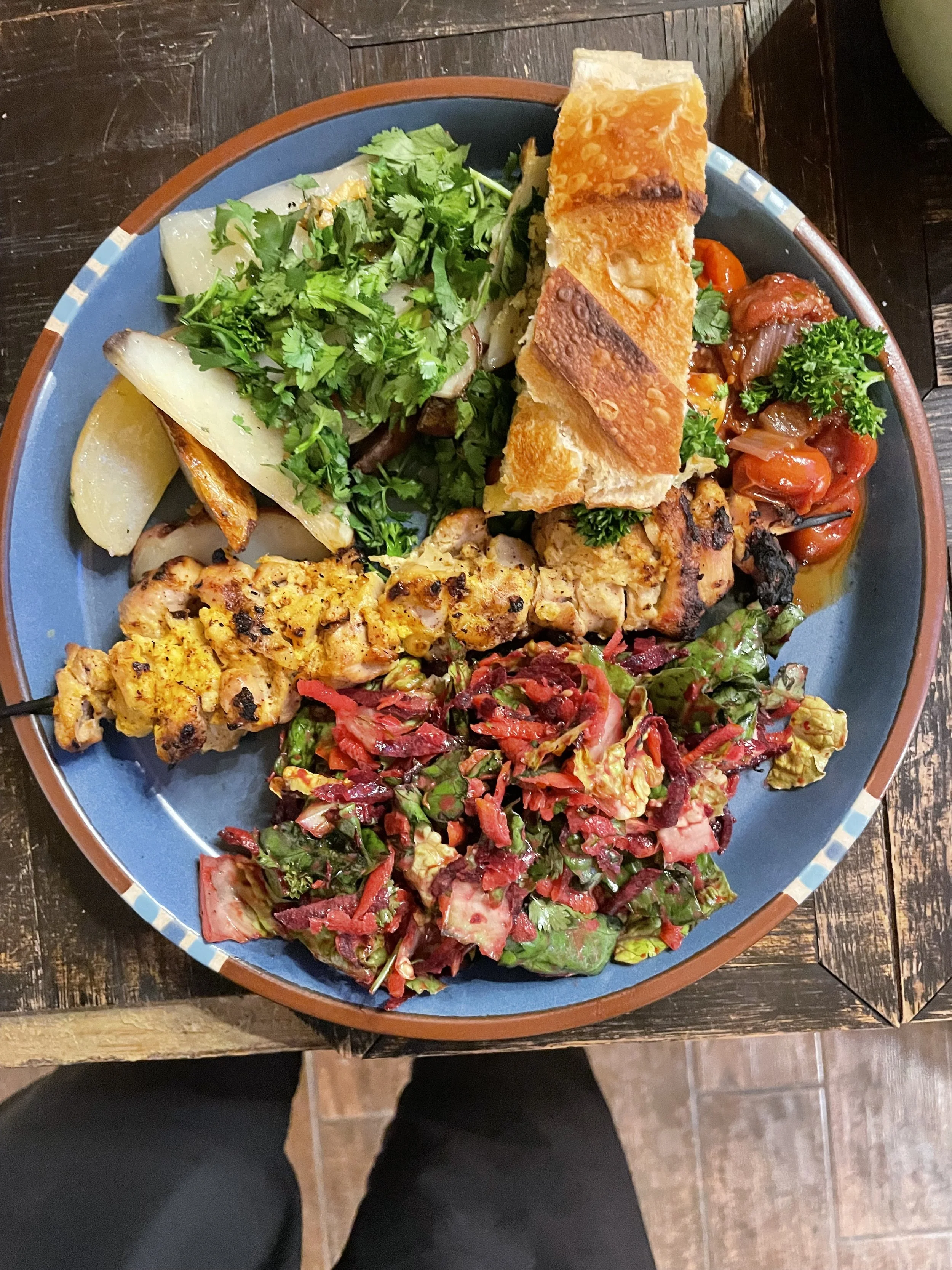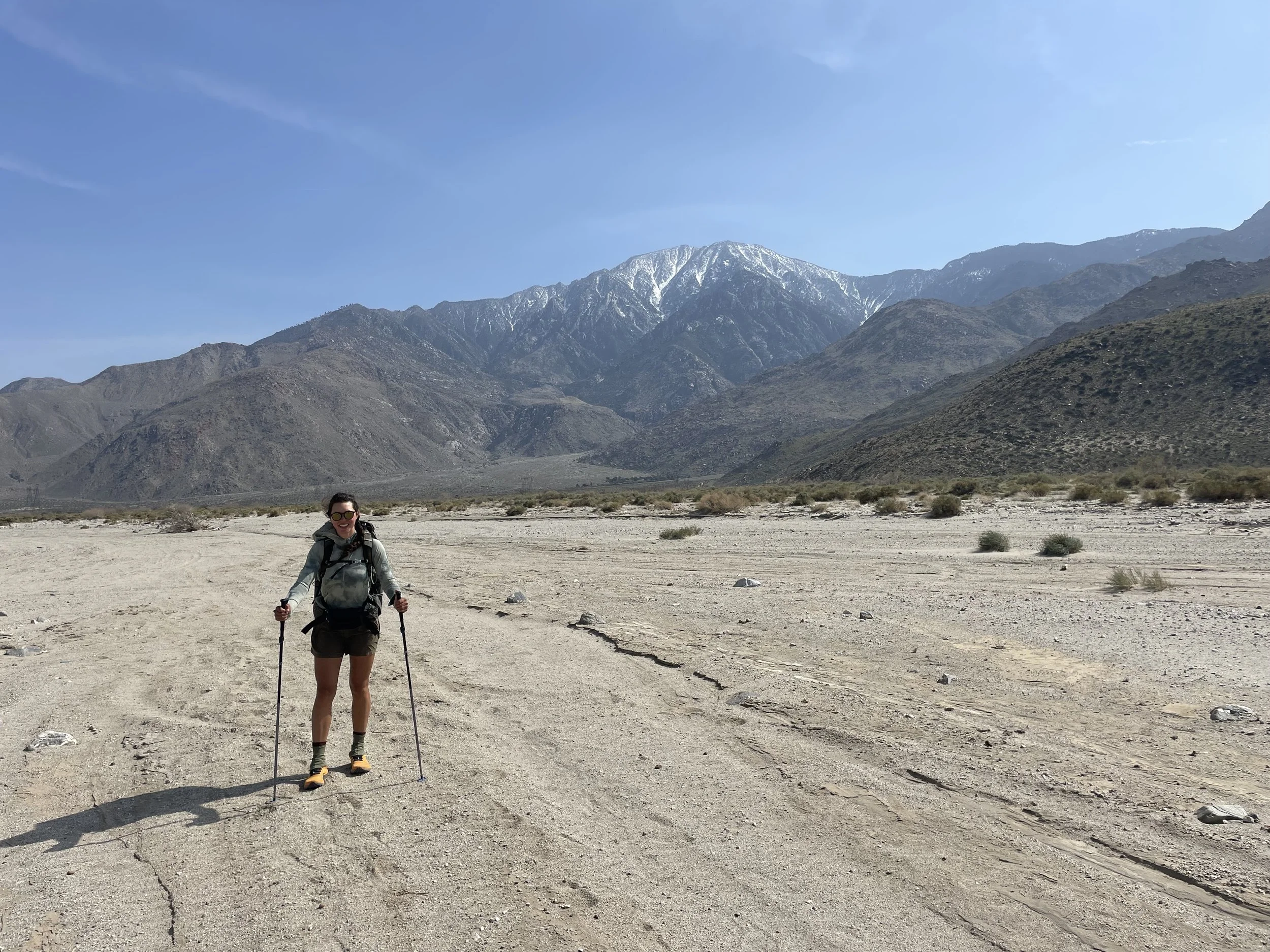 My mom dropped us off in raging wind, and we climbed higher past rows of wind turbines slicing through the sky. Our descent led us to the Whitewater River—the largest crossing in Southern California’s PCT section—and there we paused. Blaze Pizza (packed out from town) and a cold river soak made for my favorite lunch break yet. I was in heaven.